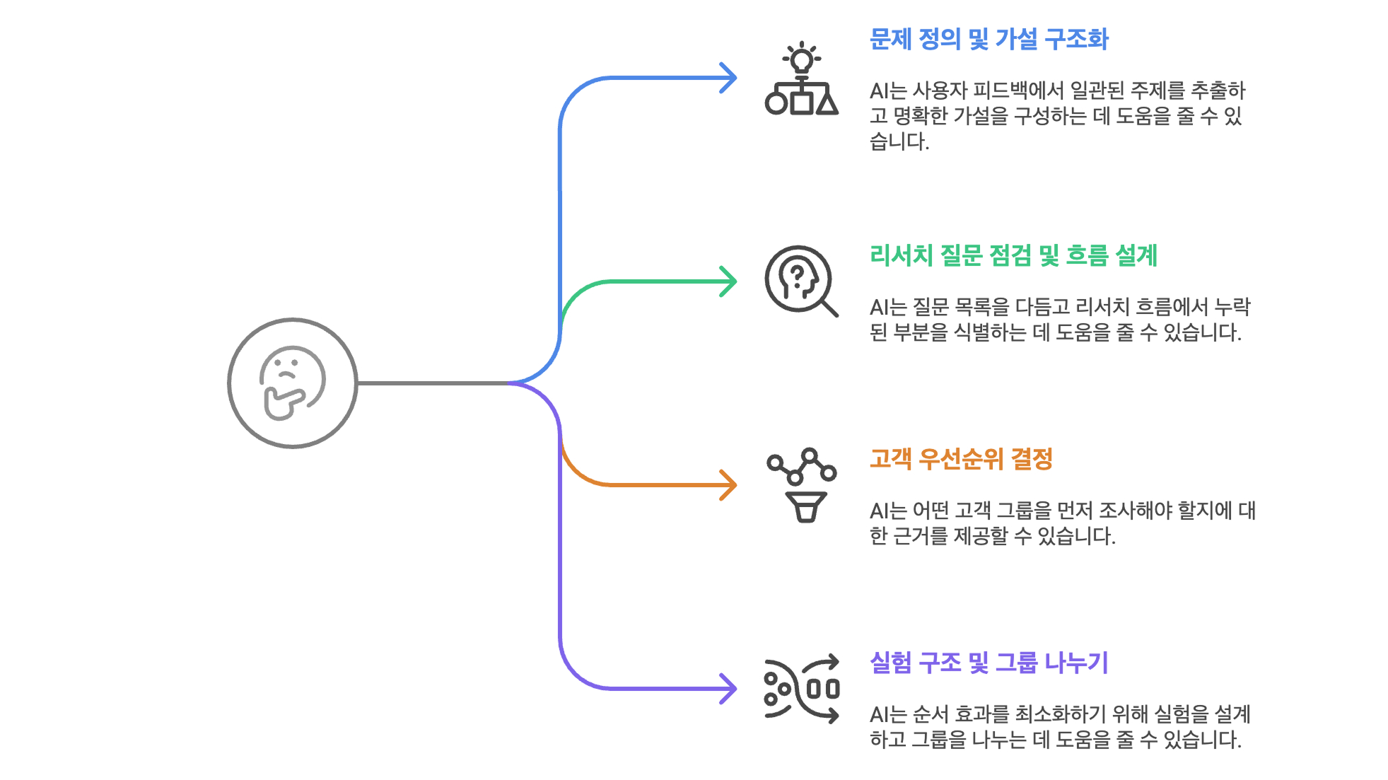 이제 반복적인 작업은 대부분 AI가 대신합니다. VoC 정리, 가설 구조화, 인터뷰 요약, 보고서 작성처럼 시간과 체력이 많이 드는 작업들이 대표적이에요. 예전에는 이런 일에 많은 시간을 썼다면, 이제는 큰 틀만 잡아두면 나머지는 AI가 빠르게 도와주죠.